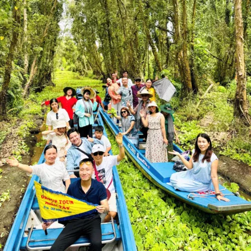 11h30: Đến Rừng Tràm Trà Sư, Quý khách tham quan: Đoàn được Checkin chụp hình với Cầu Kiều vô cùng đẹp mắt, tiếp tục xuống “Tắc Ráng – phương tiện đường thủy” di chuyển xuyên Rừng Tràm Trà Sư – nơi tái hiện đặc sắc hệ thống rừng ngập nước ngọt của ĐBSCL ngày xưa. Đoàn sẽ được len lỏi giữa những đầm sen hương thơm ngạt ngào, những dãy bèo xanh thẫm.