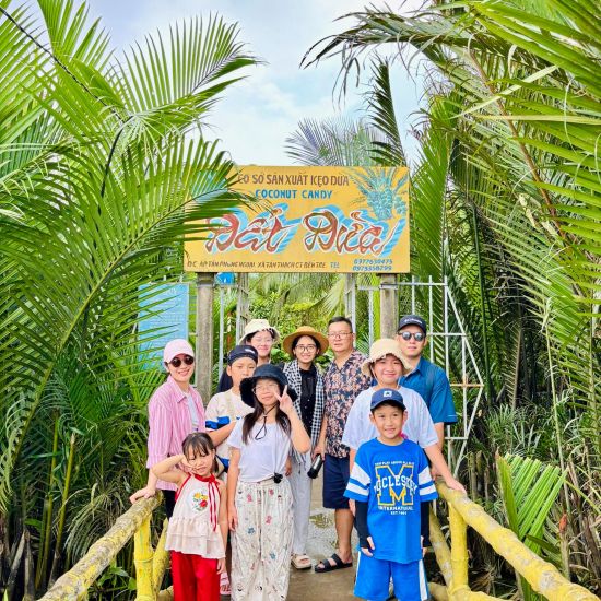 Tiếp tục hành trình, Quý khách sẽ được trải nghiệm đò – xuồng 3 lá (khoảng 15 phút chèo đò) men theo bờ kênh xanh mướt rợp bóng dừa nước, xuồng chở Quý khách ra lại thuyền máy. Quý khách tiếp tục tham quan Cơ Sở Sản Xuất Kẹo Dừa thuyền chạy dọc theo bờ kênh với 2 bên là vườn cây ăn trái, Quý khách vào tham quan cơ sở làm kẹo dừa, tận mắt xem quy trình sản xuất kẹo dừa.