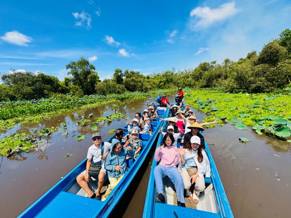 Quý khách bắt đầu tham quan hệ sinh thái rừng tràm ngập nước tuyệt đẹp vào buổi sáng theo lộ trình. Quý khách tản bộ 500m từ bãi xe vào đến bến đò sau đó đi tắc ráng (xuồng máy) khoảng 10 phút chạy dọc bờ kênh trong rừng tràm rợp mát với khung cảnh tựa như tranh đến trạm dừng đầu tiên.
